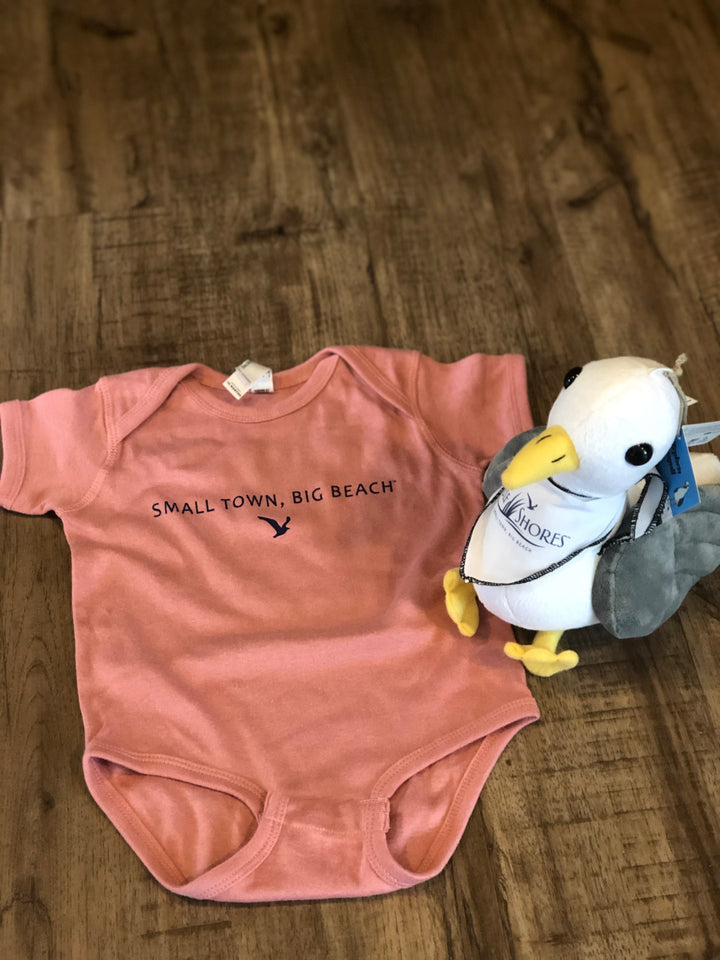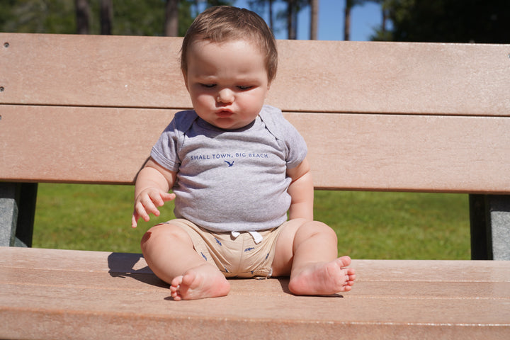 Dress your tiniest beach buddy in Gulf Shores charm with this adorable onesie! Soft, comfortable, and perfect for every day snuggles, it features our iconic tagline and seagull graphic that adds a touch of seaside style. Whether it's naptime, playtime, or their first trip to the beach, this little outfit keeps your baby cozy while repping your favorite shore town.