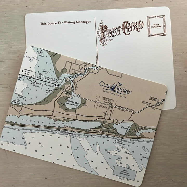 Share a piece of the coast with this beautifully detailed Gulf Shores nautical map postcard - perfect for sending, collecting, or framing as a mini art print.
