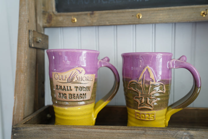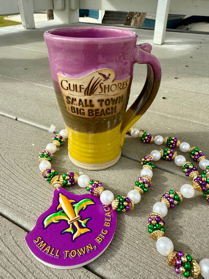 Kick off Mardi Gras in true Gulf Shores style with this colorful, limited-edition mug! Handcrafted by Steve and Dee of Sea Oat Studio, each mug is dipped in bright purple, green, and gold - the perfect trio for sipping in full Carnival spirit.