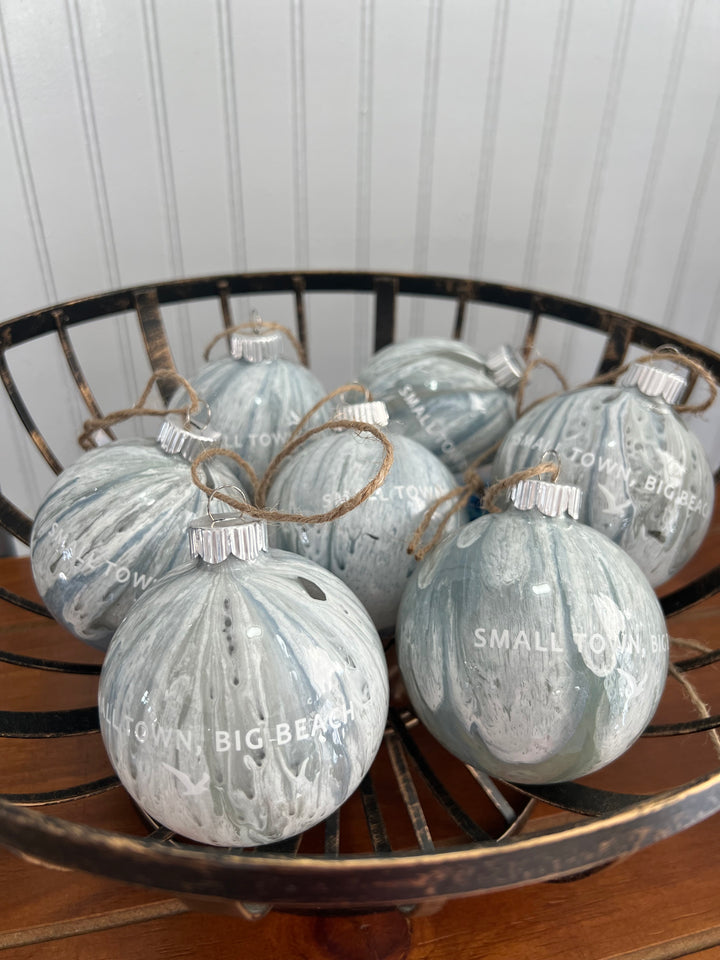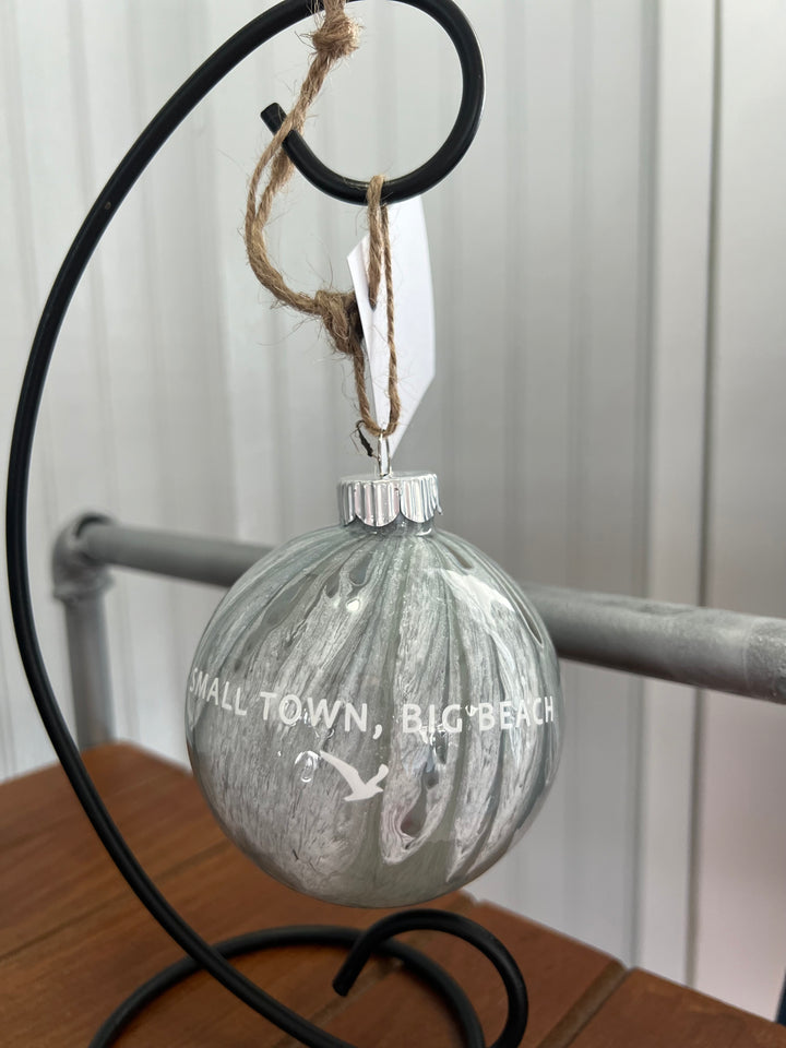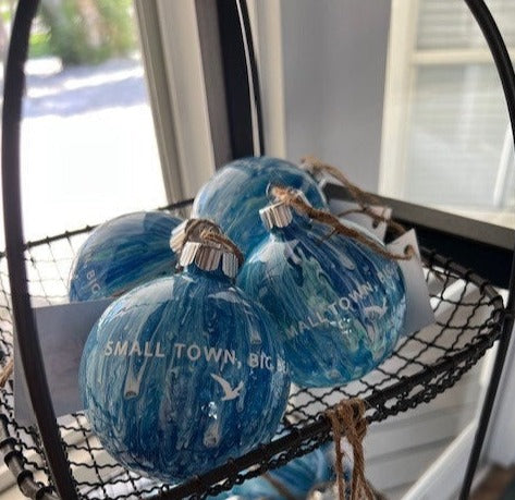 Bring some coastal cheer to your holiday decor with this handcrafted resin ornament. Each piece features our logo, surrounded by swirling resin details inside a clear glass globe, capturing the colors and movement of the Gulf Shores coastline.