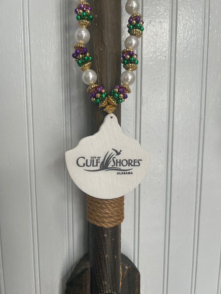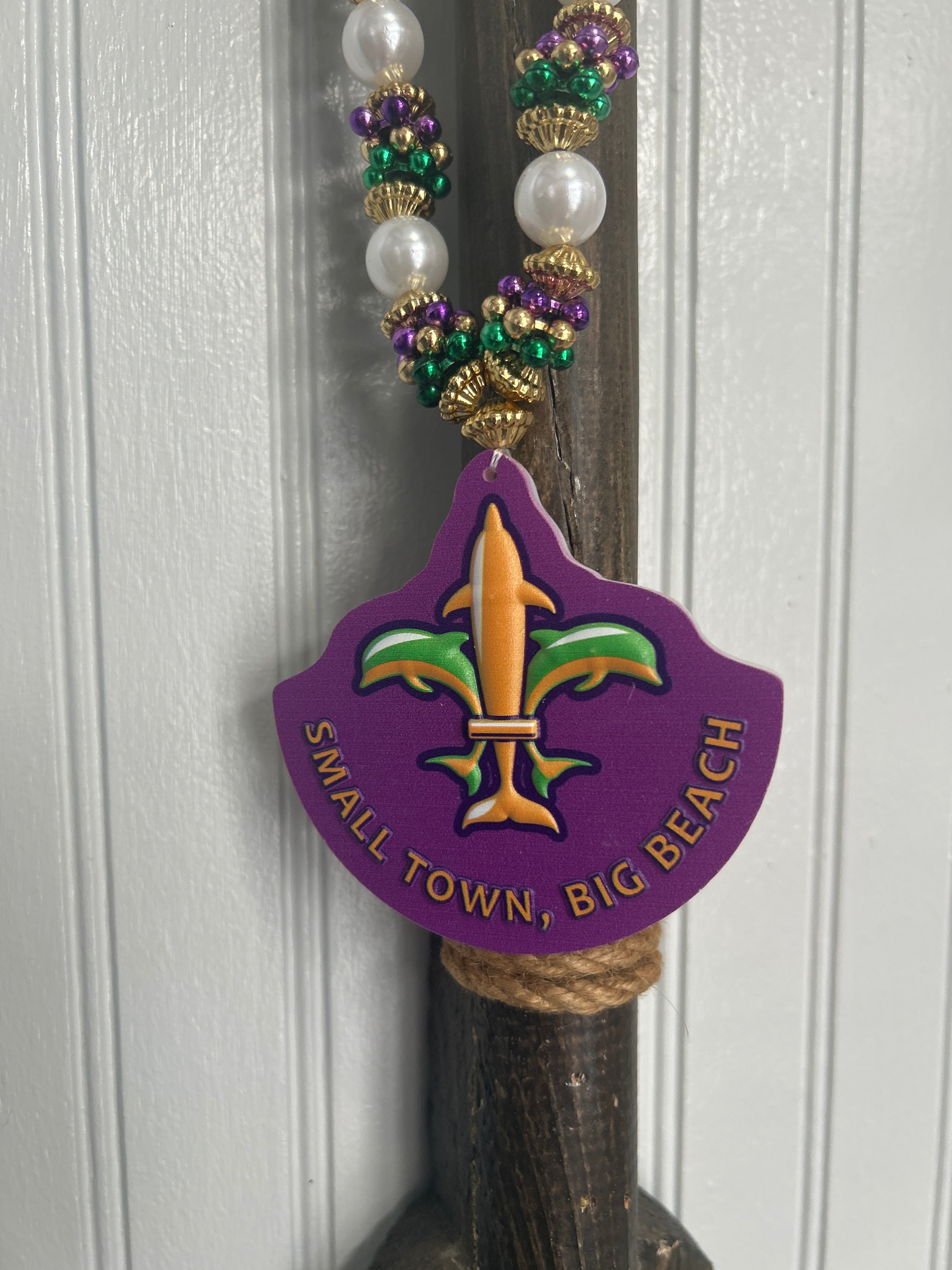 Celebrate Mardi Gras in style with this deluxe SMALL TOWN, BIG BEACH™ necklace, featuring rich purple, green, and gold beach clusters and oversized pearl accents. The bold fleur-de-lis medallion made up of three dolphins adds a coastal twist to a classic Mardi Gras look, making this piece stand out from typical parade throws.