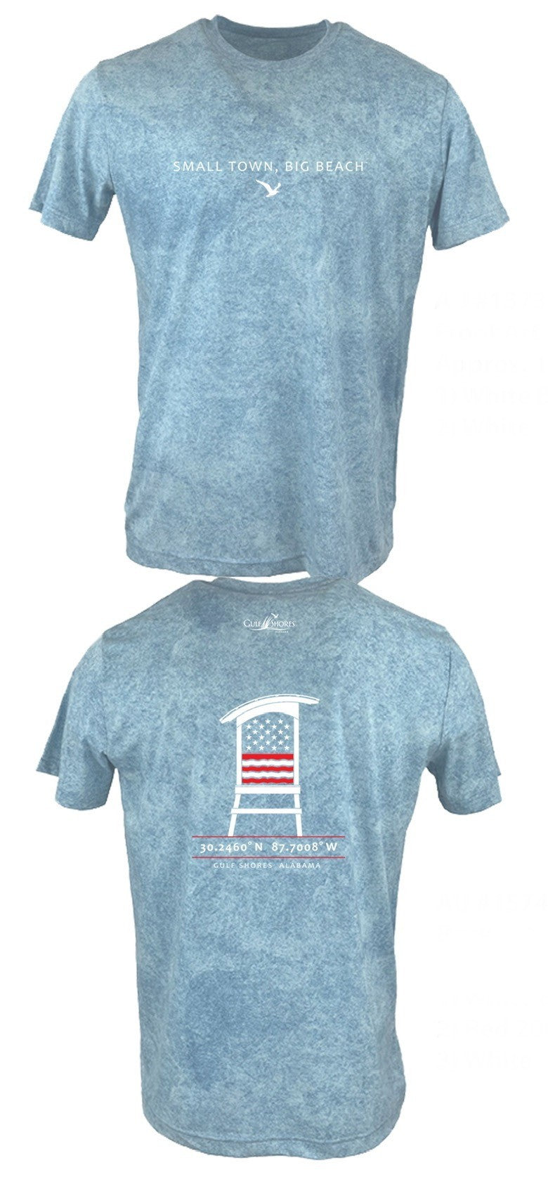 The back of the shirt showcases a bold, coastal-inspired design: a stylized lifeguard stand displaying an Americana theme. Exact geographic coordinates are printed in crisp white lettering, marking the location of the beautiful Gulf Shores, Alabama.